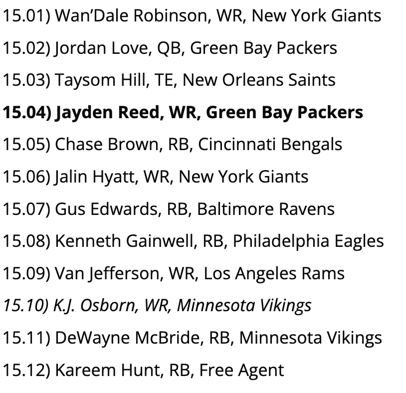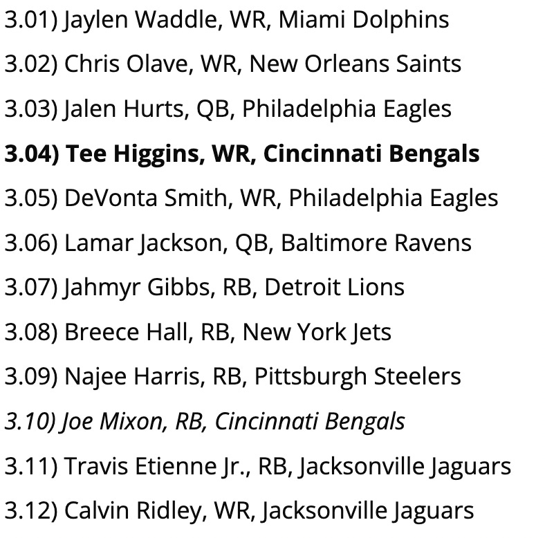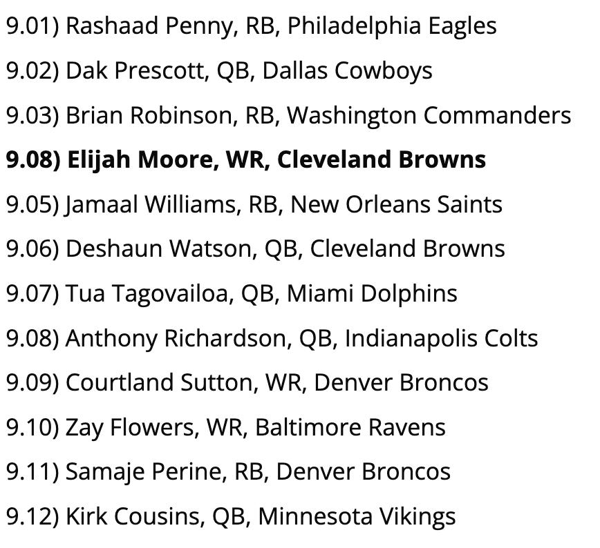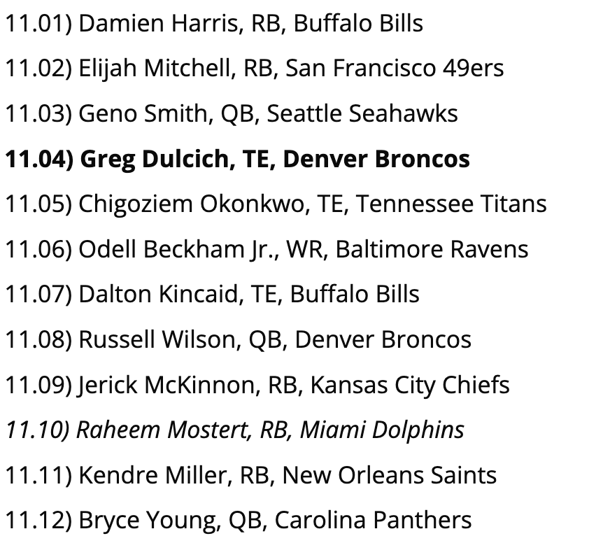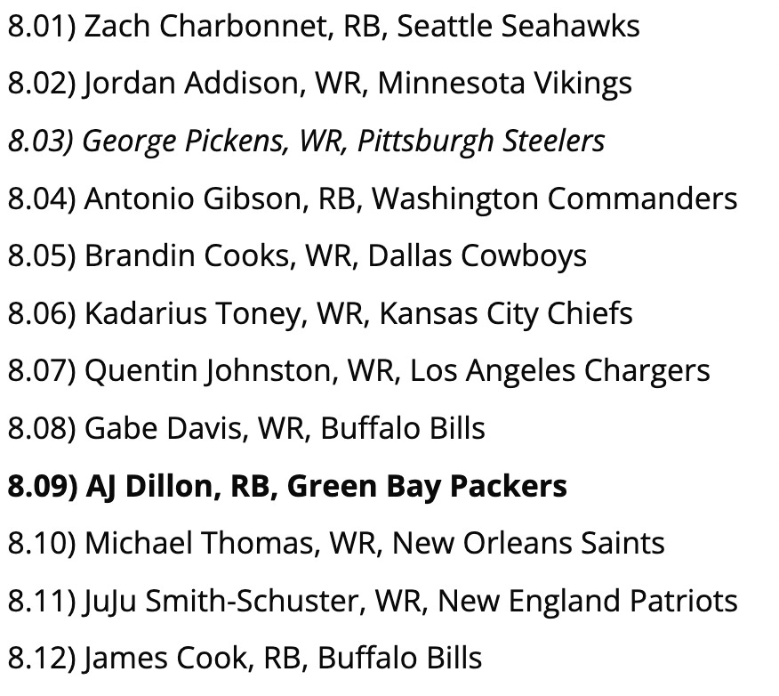Biggest Reach: None of these picks are bad per se, but players like D’Onta Foreman and Jeff Wilson, Jr. may wind up being the lead backs on their respective teams in Week 1, so we’d probably go with one of them over Kendre Miller at 11.11.