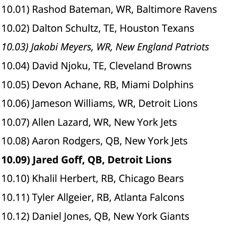Biggest Reach: Jameson Williams is uber-talented… he’s also going to miss the first six games of the 2023 campaign due to violating the NFL’s gambling policy. Instead, give me a guy like Allen Lazard whose chemistry with Aaron Rodgers should pay immediate dividends for the Jets.