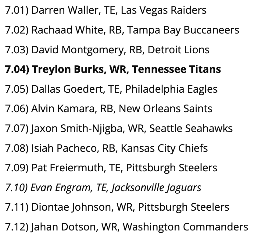Best Pick: The run on tight ends begins here, and we’re big fans of Chig Okonkwo - we actually like him better than Dalton Schultz who was taken one round earlier. DeAndre Hopkins should draw some attention away from Okonkwo, who had the fifth-most receiving yards of any TE in the 2nd half of last season.