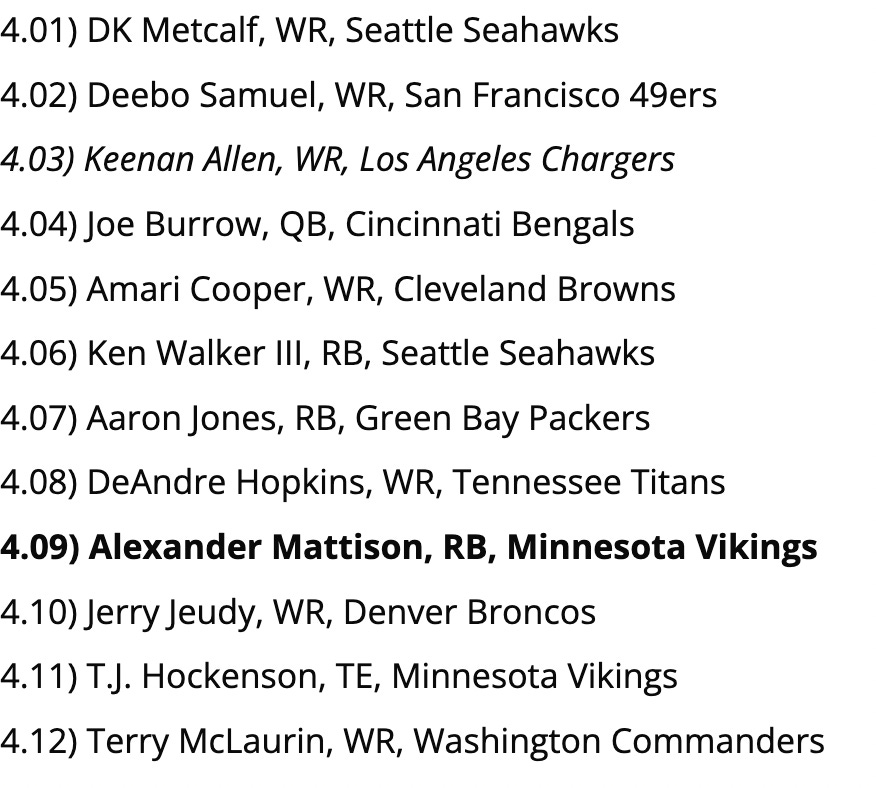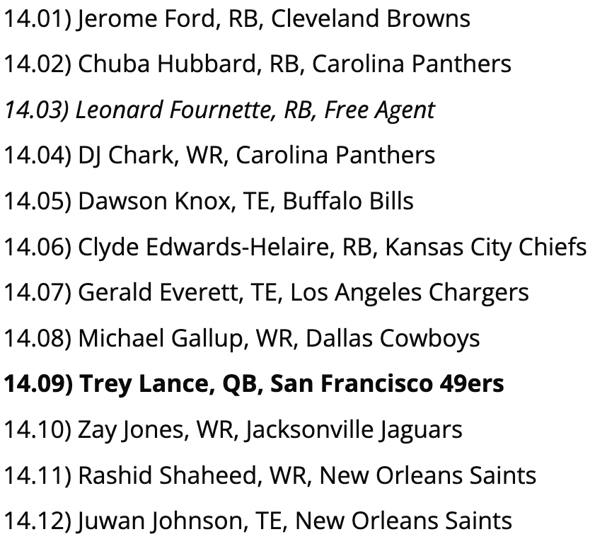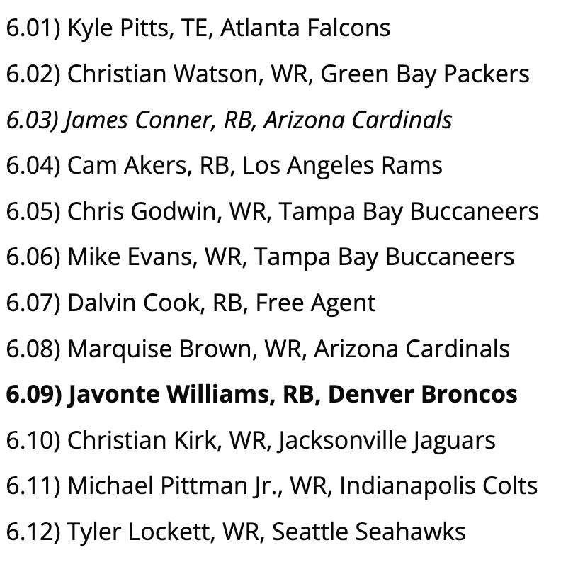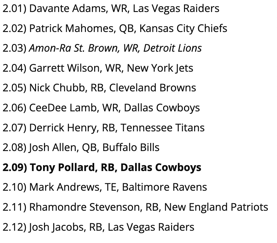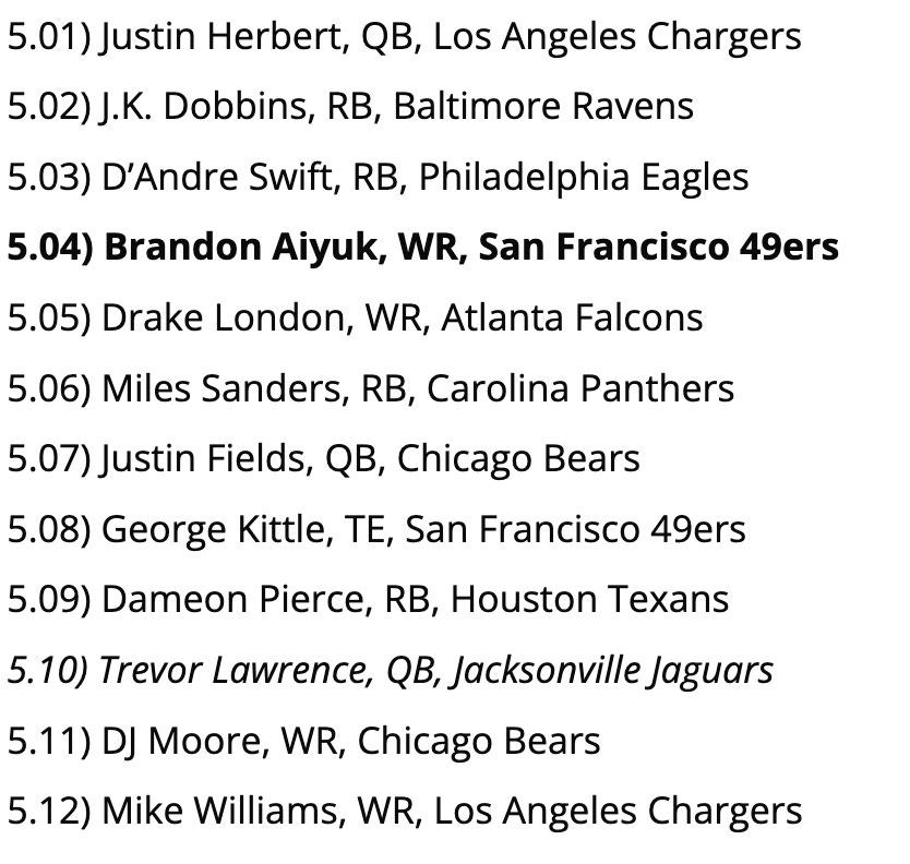 Biggest Reach: So, Brandon Aiyuk is consistent - only 3 games last season with < 7 fantasy points - but he’s not a guy you want to lean on as your WR2, if you can avoid it. This pick would be fine in the 6th round, but not so much here.