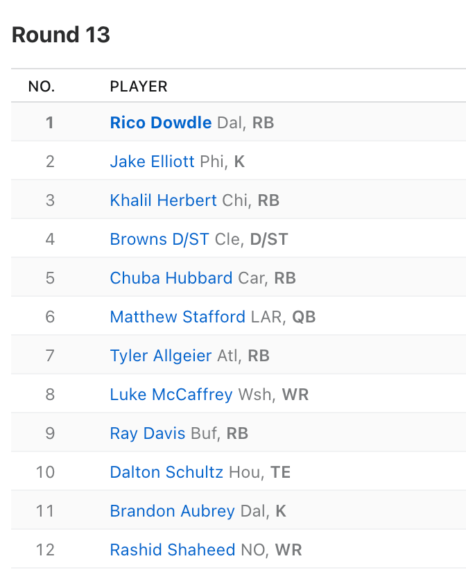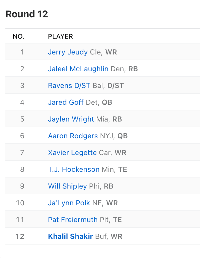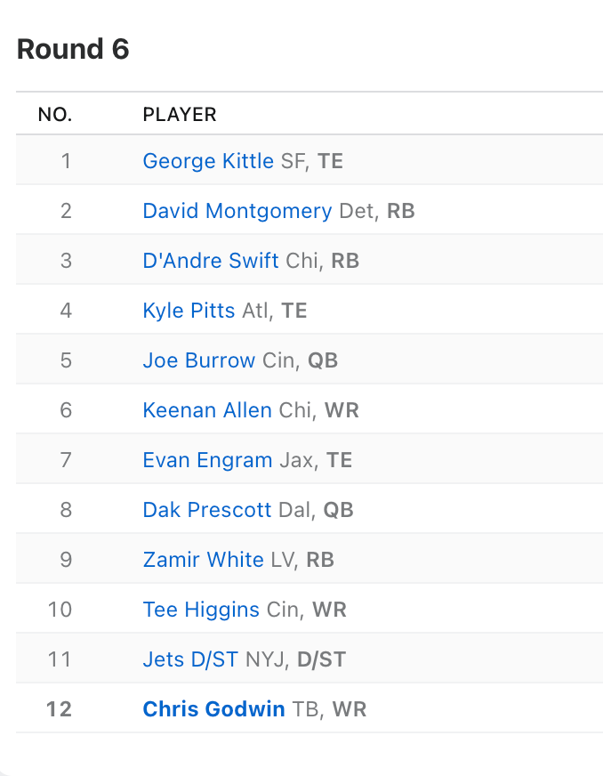 Biggest Reach: Picking a defense - even the Jets - at any time before the last couple of rounds is always a mistake, but in this manager’s defense, it was an autopick due to a faulty Internet connection.