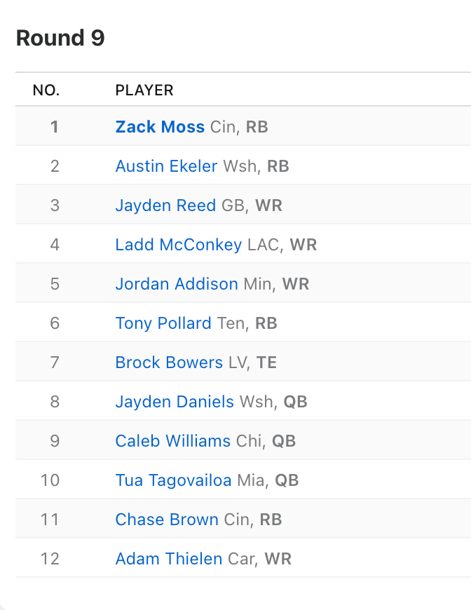 Biggest Reach: Even if you’re in the market for a WR, it’s nearly impossible to justify taking Malik Nabers ahead of guys like Cooper Kupp, Deebo Samuel, DeVonta Smith, and Brandon Aiyuk.