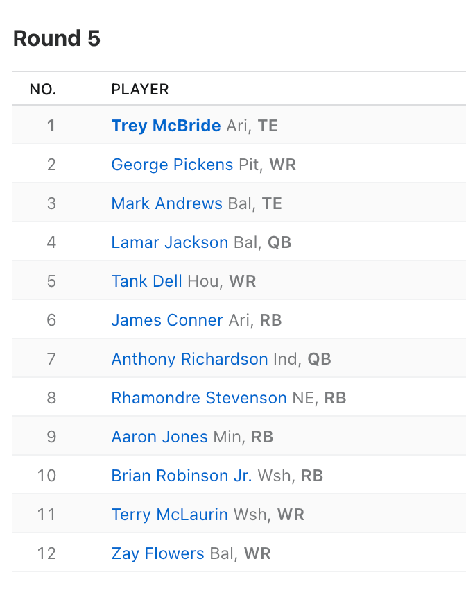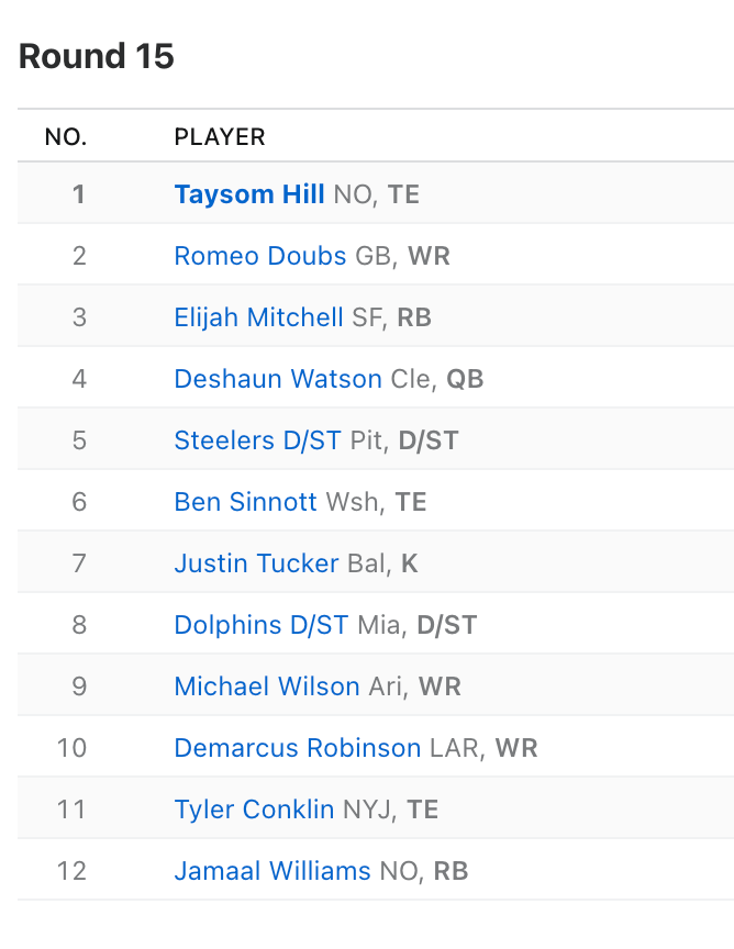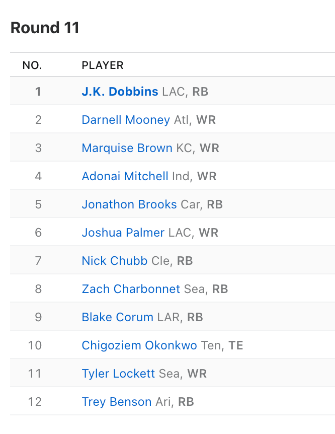 Best Pick: We’re bullish on two of the tight ends picked in this round (Hill and Tyler Conklin)… if nothing else, this draft has taught us that you can absolutely wait on the TE position without sacrificing a massive number of points every week.