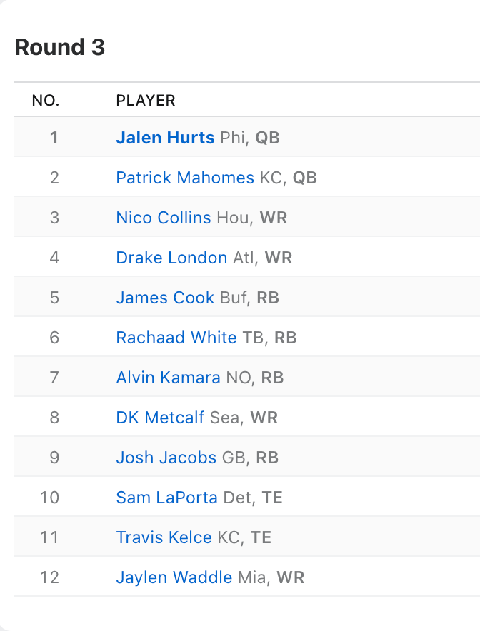 Biggest Reach: Probably a slight reach for Jalen Hurts at 3.01 - FantasyPros currently has him as the 3rd quarterback going off of the board in most drafts with an ADP of 31.4.