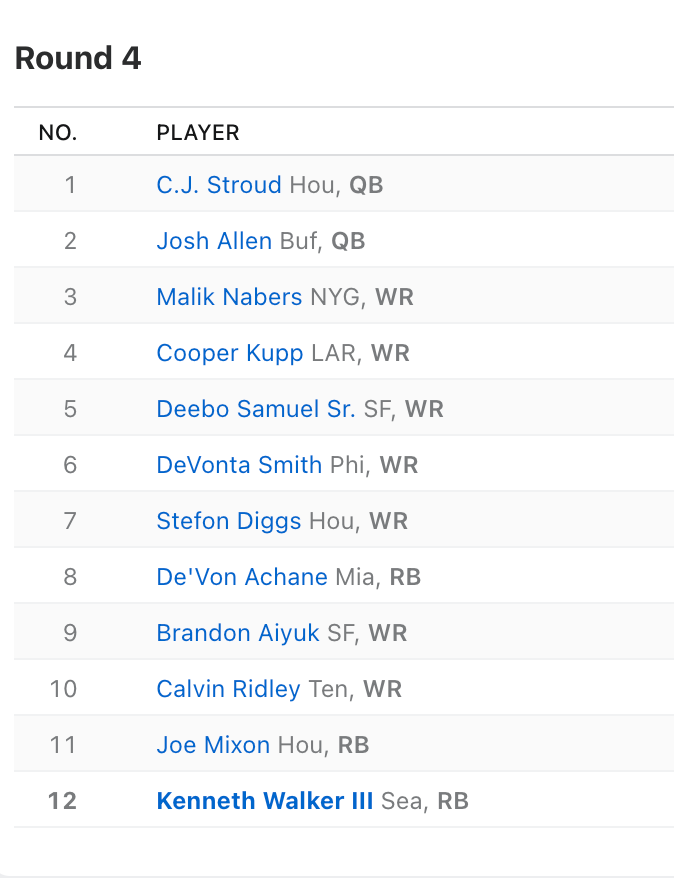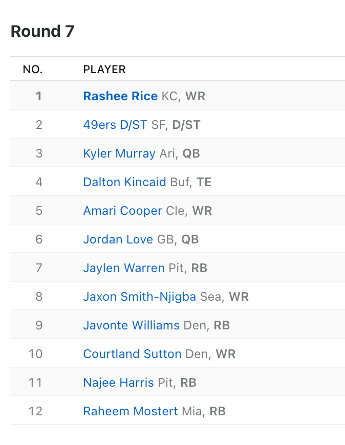 Biggest Reach: We’ll ignore the auto-picked defense this time and focus on Jaxon Smith-Njigba. If you *really* like him, then you may not consider taking him at 7.08 as a reach, but he’s WR40 on the consensus fantasy boards, and is lasting until the 9th round in the average PPR league.