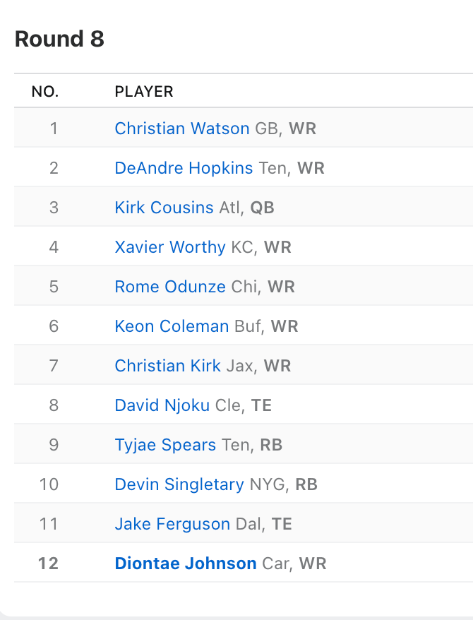 Biggest Reach: Let’s stay with the Kirk theme for a second: This is extremely too early for Kirk Cousins. I don’t care how bullish you are on the Falcons’ offense: It’s going to be hard for him to finish with a 4,000-yard campaign fresh off of a torn Achilles. In Round 8, there are other proven - and healthier - QB options on the board.