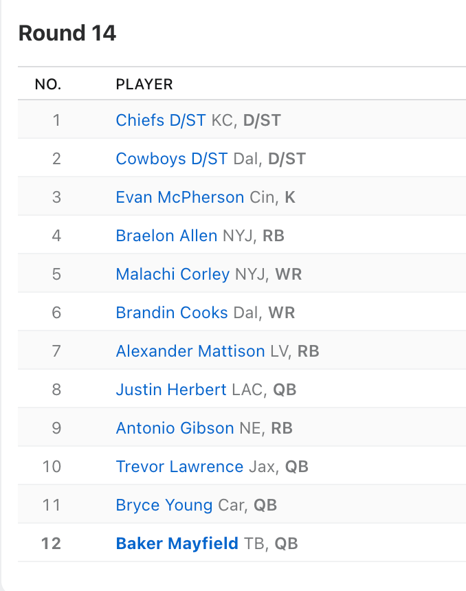 Biggest Reach: This is sill far too early to take a kicker, but if you’re going to do so, former soccer player Brandon Aubrey - who led the NFL in points last season in 157 - isn’t a bad option.